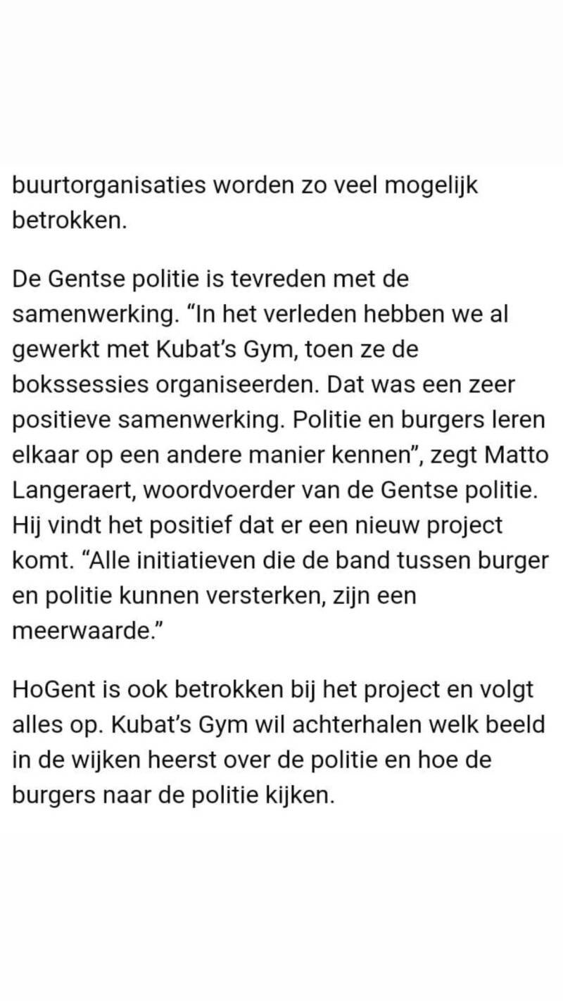 Project KOMBI brengt Gentenaars en politieagenten samen om wederzijds begrip en respect te bevorderen, vooral daar en met wie de relatie stroef verloopt. Door activiteiten zoals boksen, gamen en barbecueën leren beide groepen elkaar beter kennen. Dit project helpt spanningen verminderen door persoonlijke interacties te stimuleren. Gentenaars en agenten oefenen samen en delen ervaringen, wat leidt tot positieve veranderingen in hun onderlinge relaties. Het doel is om in de komende jaren in meerdere wijken duurzame 'wijkallianties' op te bouwen.